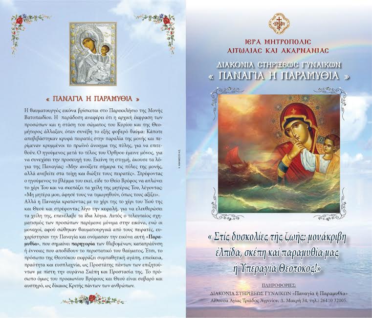 Η Ιερά Μητρόπολη Αιτωλίας και Ακαρνανίας ανακοινώνει ότι την προσεχή Τετάρτη 19 Οκτωβρίου 2016 και ώρα 06:00’ το απόγευμα στο Κέντρο της Διακονίας Στηρίξεως Γυναικών «Παναγία η Παραμυθία» της Ιεράς Μητροπόλεώς μας, που βρίσκεται στο ισόγειο της αίθουσας του Ιερού Ναού Αγίας Τριάδος Αγρινίου θα πραγματοποιηθεί η έναρξη των δραστηριοτήτων της Διακονίας.