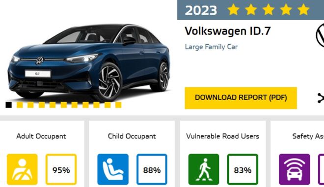 Συγκεκριμένα, το ID.7 αξιολογήθηκε με βαθμολογία 95% για την προστασία ενηλίκων που είναι η υψηλότερη που έχει καταγραφεί για ένα ευρωπαϊκής κατασκευής ηλεκτρικό αυτοκίνητο. Εξαιρετική ήταν η αξιολόγηση και στην προστασία ανηλίκων με 88%, ενώ το ίδιο ισχύει τόσο για την προστασία πεζών με 83% όσο και για τα ηλεκτρονικά συστήματα ασφάλειας με 80%.
