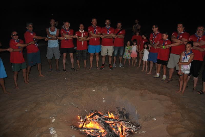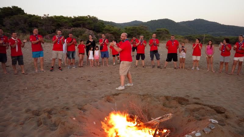 Αποκορύφωμα της τριήμερης κατασκήνωσης ήταν η πυρά γέλιου το βράδυ του Σαββάτου. Γύρω από τη φωτιά που άναψαν στην παραλία της Ελαίας, δίπλα στις εκβολές της Νέδας, οι παλαιοί πρόσκοποι διασκέδασαν με παλιό καλό προσκοπικό τραγούδι, παιχνίδι και αυτοσχέδια σατυρικά θεατρικά σκετσάκια.