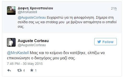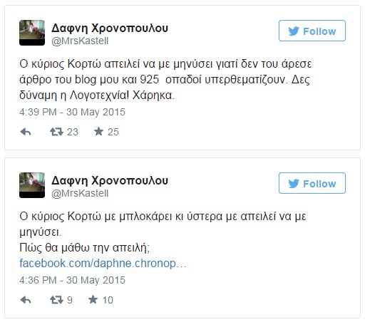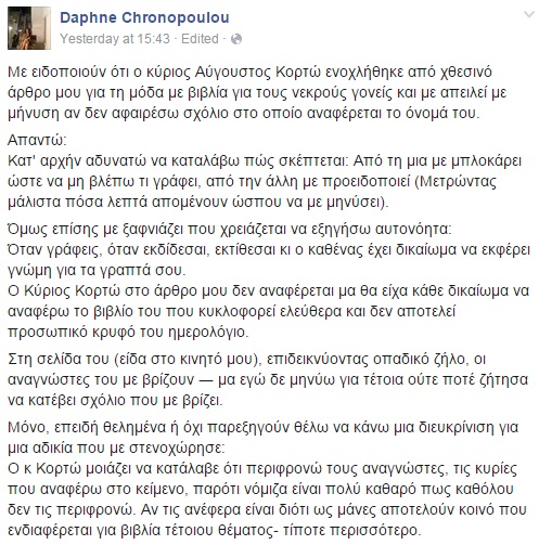 Με ανάρτησή της στο facebook, η Δάφνη Χρονοπούλου γράφει ότι ο Αύγουστος Κορτώ την απειλή με μήνυση αν δεν αφαιρέσει αρνητικό σχόλιο στο οποίο αναφέρεται το όνομά του: