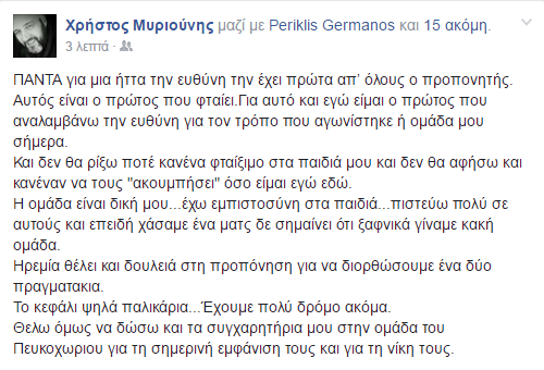 ”ΠΑΝΤΑ για μια ήττα την ευθύνη την έχει πρώτα απ’ όλους ο προπονητής. Αυτός είναι ο πρώτος που φταίει.Για αυτό και εγώ είμαι ο πρώτος που αναλαμβάνω την ευθύνη για τον τρόπο που αγωνίστηκε ή ομάδα μου σήμερα.