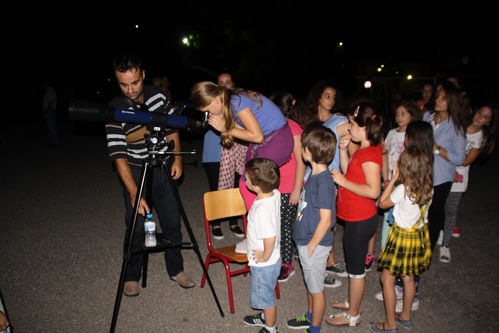 Στη συνέχεια στο προαύλιο του σχολείου έγινε αστροπαρατήρηση με τη χρήση τηλεσκοπίων και την καθοδήγηση του Λίνου Υφαντή και του Άγγελου Μακρή, με τα παιδιά να ¨μαγεύονται¨ και να εντυπωσιάζονται από τις κοντινές εικόνες του φεγγαριού και την λαμπερή πανσέληνο, καθώς και των πολύ μακρινών σε εμάς πλανητών, Άρη και Κρόνο!