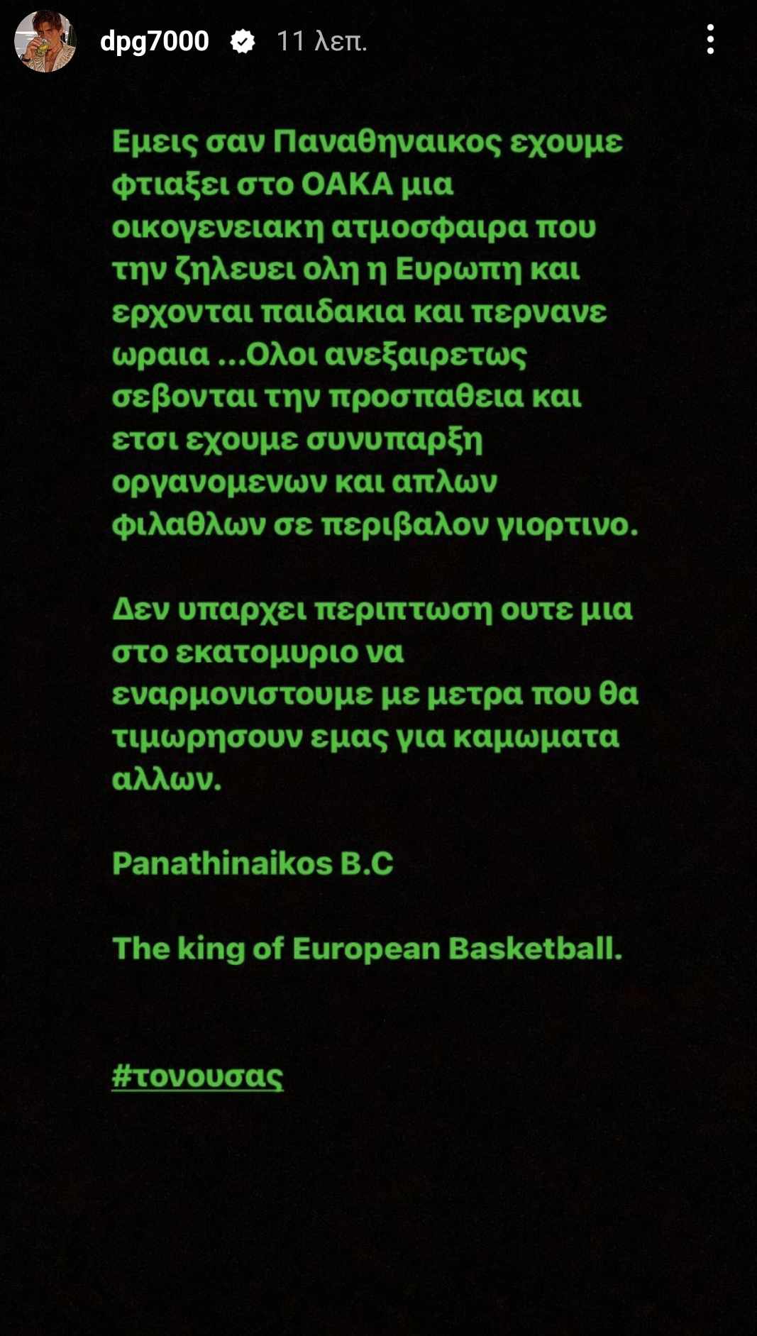 «Εμείς ως Παναθηναϊκός έχουμε φτιάξει στο ΟΑΚΑ μία οικογενειακή ατμόσφαιρα που τη ζηλεύει όλη η Ευρώπη και έρχονται παιδάκια και περνάνε ωραία. Όλοι ανεξαιρέτως σέβονται την προσπάθεια και έτσι έχουμε συνύπαρξη οργανωμένων και απλών φιλάθλων σε περιβάλλον γιορτινό.