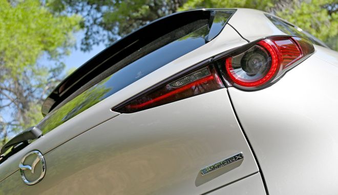 Η σιλουέτα του CX-30 μοιάζει με σπορ αυτοκίνητα μεγάλου rake, δηλαδή αυξημένης γωνίας του δαπέδου ως προς το έδαφος: χαμηλότερο ρύγχος, ψηλότερη ουρά. Στο δυναμισμό του παίζει ρόλο και η σφηνοειδής σχεδίαση της μάσκας με τη μεγάλη κυψελοειδή γρίλια, το χρωμιωμένο της πλαίσιο, τα αιχμηρά φωτιστικά σώματα εμπρός και πίσω, και βέβαια η κλίση της πίσω κολόνας.