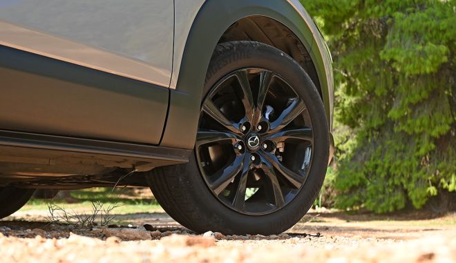 Το μαύρο χρώμα των ζαντών -με πέντε ζευγάρια ακτινών- και των καθρεπτών, χαρακτηριστικό της έκδοσης Homura, δίνουν παραπάνω δύναμη στη σχεδιαστικής φιλοσοφίας Kodo. Συνδυάζεται με το ίδιο χρώμα των πλαστικών προστατευτικών των θόλων και των μαρσπιέ, που είναι απρόσμενα μεγάλα. Αλλά σε κάθε περίπτωση αυτά είναι που δίνουν τον Crossover προσανατολισμό στο CX-30, μαζί με την αύξηση του ύψους από το έδαφος στα 17,5 εκατοστά.