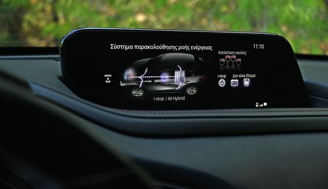 Μια άλλη ιδιαιτερότητα είναι ότι η κεντρική οθόνη των 8,8” δεν είναι αφής -είναι αρκετά μακριά από τον οδηγό για να είναι κάτι τέτοιο πρακτικό- αλλά λειτουργεί μέσω του περιστροφικού επιλογέα που βρίσκεται στο κέντρο της κονσόλας. Μια άλλη υποκειμενική άποψη, εδώ, είναι πως αυτό είναι πολύ πιο εύχρηστο και πρακτικό, από το να χειρίζεσαι με την αφή μια οθόνη εν κινήσει. Μοιάζει να σε αποσπά πολύ λιγότερο από το δρόμο – και είναι και πιο κοντά στο οπτικό πεδίο του δρόμου. Σε αυτό παίζει φυσικά ρόλο και το πολύ εύχρηστο μενού της Mazda, παρότι δεν έχει τα φαντασμαγορικά γραφικά του ανταγωνισμού.