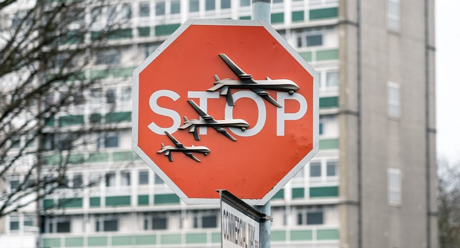 Τα αεροσκάφη στην πινακίδα έμοιαζαν με εκείνα από το έργο του Banksy “Civilian Drone Strike” του 2017, το οποίο απεικόνιζε ένα τρίο μη επανδρωμένων αεροσκαφών να βομβαρδίζουν έμα παιδικό σχέδιο ενός σπιτιού. Το έργο δημοπρατήθηκε στο Art The Arms Fair και συγκέντρωσε 205.000 λίρες για τις οργανώσεις Reprieve και Campaign Against Arms Trade.