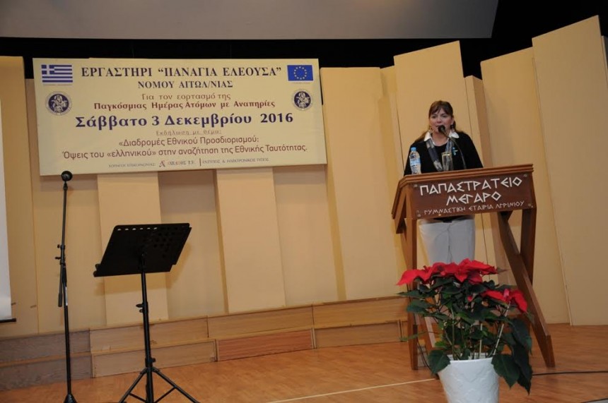 Το Εργαστήρι «ΠΑΝΑΓΙΑ ΕΛΕΟΥΣΑ» για άτομα με νοητική υστέρηση και συνοδές αναπηρίες, Νομού Αιτωλοακαρνανίας, Μεσολόγγι-Αγρίνιο, τιμώντας την 3η Δεκεμβρίου, Παγκόσμια Ημέρα των ΑμεΑ, πραγματοποίησε με μεγάλη επιτυχία και πλήθος κόσμου, πολιτιστική εκδήλωση το Σάββατο 3 Δεκεμβρίου και ώρα 7 μμ., στο Παπαστράτειο Μέγαρο Αγρινίου. Στην εκδήλωση κεντρική ομιλήτρια ήταν, η κα Ειρήνη Σαρίογλου, επίκουρος καθηγήτρια του τμήματος Νεοελληνικών σπουδών του Πανεπιστημίου της Κωνσταντινούπολης και συνιδρύτρια του Ιδρύματος Ιστορικών Μελετών. Θέμα της ομιλίας ήταν: «Διαδρομές εθνικού προσδιορισμού: Όψεις του «ελληνικού» στην αναζήτηση της εθνικής ταυτότητας». Η ακμή των ελληνικών γραμμάτων και του Ελληνισμού στην Κωνσταντινούπολη από τα μέσα του 19ου αιώνα ως τα μέσα του 20ου. Στη συνέχεια, η κα Vivian Douglas, ιατρός και υψίφωνος ερμήνευσε με την υπέροχη φωνή της, τραγούδια Ελλήνων συνθετών. Την συνόδευε στο πιάνο ο κος Σπύρος Χολέβας, Μαέστρος και Καλλιτεχνικός Διευθυντής του Δημοτικού Ωδείου της Ιερής Πόλης του Μεσολογγίου. Την εκδήλωση έκλεισε η χορωδία των εκπαιδευομένων νέων του Εργαστηρίου υπό τη διεύθυνση της κας Ευσταθίας Γρέντζελου, Kοινωνικής Λειτουργού του Εργαστηρίου και Μουσικού. Ευχές για την επιτυχία της εκδήλωσης έστειλαν: Ο Εξοχώτατος Πρόεδρος της Ελληνικής Δημοκρατίας, κ. Προκόπης Παυλόπουλος, ο Πρόεδρος της Νέας Δημοκρατίας κ. Κυριάκος Μητσοτάκης, ο αναπληρωτής Υπουργός Οικονομικών και ανάπτυξης κ. Αλέξης Χαρίσης, η Υφυπουργός Οικονομικών κα Κατερίνα Παπανάτσιου, ο κ. Δημήτρης Τζανάτος από την Grant Thornton Greece, Σώμα Ορκωτών Λογιστών. Την εκδήλωση τίμησαν με την παρουσία τους, η Αντιπεριφερειάρχης Π.Ε. Αιτωλ/νίας κα Χριστίνα Σταρακά, η οποία απηύθυνε και χαιρετισμό, οι αντιδήμαρχοι κος Κώστας Καλαντζής, ο οποίος και χαιρέτισε την εκδήλωση και η κα Μαρία Παπαγεωργίου. Επίσης, εκπρόσωπος του Δημάρχου Μεσολογγίου, εκπρόσωποι φορέων και οργανισμών. Χαιρετισμό εκ μέρους του Διοικητικού Συμβουλίου του Εργαστηρίου απηύθυνε το μέλος του κα Ελένη Μούρτη-Μάλαινου. Ευχαριστούμε θερμότατα όλους τους επίσημους προσκεκλημένους μας και τους φίλους συμπολίτες μας από Αγρίνιο και Μεσολόγγι και την ευρύτερη περιοχή καθώς και όλους όσους μας τίμησαν με την παρουσία τους κατακλύζοντας την αίθουσα και χειροκροτώντας με ενθουσιασμό τους εκπαιδευομένους νέους μας. Η παρουσία σας, ενδυναμώνει την προσπάθεια και το δύσκολο έργο του Εργαστηρίου «ΠΑΝΑΓΙΑ ΕΛΕΟΥΣΑ».