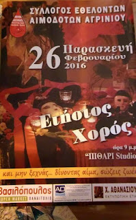 Ο Σύλλογος Εθελοντών Αιμοδοτών Αγρινίου σας προσκαλεί στον ετήσιο χορό του την Παρασκευή 26 Φεβρουαρίου 2016 και ώρα 9μμ στο ΠΙΘΑΡΙ Studio στην περιοχή Γιαννούζι. Η τιμή της πρόσκλησης είναι στα 12 ευρώ με φαγητό και η φοιτητική πρόσκληση στα 10 ευρώ (με επίδειξη πάσο).