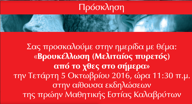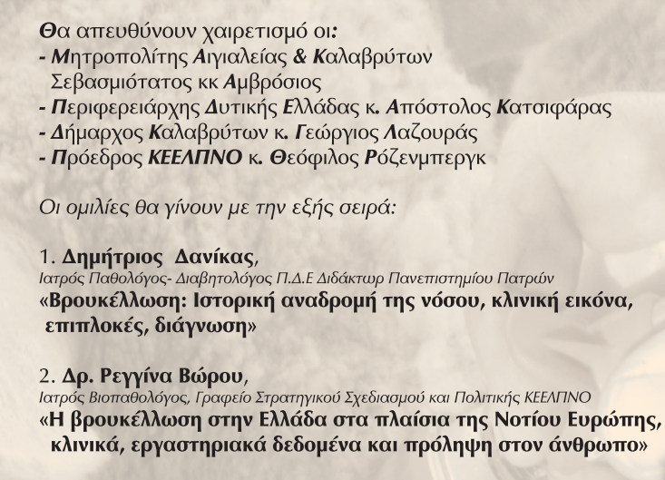 Η Περιφέρεια Δυτικής Ελλάδας σε συνεργασία με τον Δήμο Καλαβρύτων και το Κέντρο Ελέγχου και Πρόληψης Νοσημάτων (ΚΕ.ΕΛ.Π.ΝΟ.) διοργανώνει ημερίδα με θέμα «Βρουκέλλωση (μελιταίος πυρετός) από το χθες στο σήμερα».