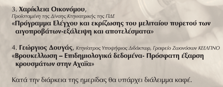 - «Προγράμματα ελέγχου και εκρίζωσης του μελιταίου πυρετού των αιγοπροβάτων – εξάλειψη και αποτελέσματα», Χαρίκλεια Οικονόμου, προϊσταμένη της Διεύθυνσης Κτηνιατρικής της ΠΔΕ