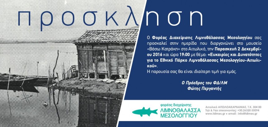 Ο Φορέας Διαχείρισης Λιμνοθάλασσας Μεσολογγίου στο πλαίσιο της πολυδραστηριότητάς του και της εξωστρέφειας διοργανώνει ημερίδα στο μουσείο «Βάσω Κατράκη» στο Αιτωλικό την Παρασκευή 2 Δεκεμβρίου 2016 και ώρα 19:00 με θέμα «Ευκαιρίες και Δυνατότητες για το Εθνικό Πάρκο Λιμνοθάλασσας Μεσολογγίου- Αιτωλικού». Στην ημερίδα επιστήμονες, εμπειρογνώμονες και στελέχη από τον ακαδημαϊκό χώρο, την αγορά, τις μη κυβερνητικές οργανώσεις αλλά και τις αναπτυξιακές εταιρείες θα παρουσιάσουν τις ευκαιρίες και τις δυνατότητες να αναπτυχθεί η οικονομία του Εθνικού Πάρκου σε κατευθύνσεις βιωσιμότητας και αειφορίας. Η παραδοσιακή αλιεία, οι αλυκές, οι παράκτιες ζώνες, αποτελούν πόρους που με την ανάλογη αξιοποίηση τους μπορούν να προσδώσουν μια καινούργια ευημερία στην περιοχή και τους ανθρώπους της. Με βασικούς άξονες την αλιεία, την γεωργία και τον τουρισμό το «πρασίνισμα» της οικονομίας θα έχει θετικό αντίκτυπο και στο περιβαλλοντικό αποτύπωμα της περιοχής. Ελάτε να δούμε μαζί το μέλλον του Εθνικού Πάρκου. Η παρουσίας σας θα είναι ιδιαίτερη τιμή για εμάς.