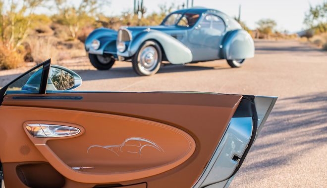 Έπειτα, η τροποποιημένη γρίλια έχει χρωμιωμένες κάθετες ράγες και πολύ πιο παχύ κεντρικό τμήμα. Το ίδιο χρώμα του αμαξώματος κοσμεί και τις γαλβανιζέ ζάντες Super Sport των πέντε ακτινών, ενώ κάτω από την πίσω πτέρυγα ένα αυτοκόλλητο απεικονίζει το σχέδιο της σιλουέτας της Type 57 SC Atlantic.