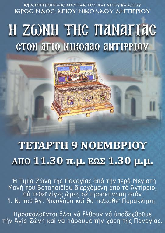 Ολιγόωρη στάση στον Ιερό Ναό Αγίου Νικολάου Αντιρρίου θα προαγματοποιήσει το μεγαλύτερο κειμήλιο ολοκλήρου του Χριστιανισμού, η Τιμία Ζώνη της Παναγίας, η οποία είναι το μοναδικό κειμήλιο από τη ζωή της Παναγίας.