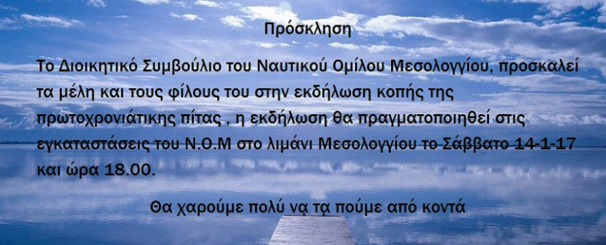 Το Διοικητικό Συμβούλιο του Ναυτικού Ομίλου Μεσολογγίου, προσκαλεί τα μέλη και τους φίλους του στην εκδήλωση κοπής της πρωτοχρονιάτικης πίτας , η εκδήλωση θα πραγματοποιηθεί στις εγκαταστάσεις του Ν.Ο.Μ στο λιμάνι Μεσολογγίου το Σάββατο 14-1-17 και ώρα 18.00. Κατά την διάρκεια της εκδήλωσης θα γίνουν απονομές πτυχίων της Σχολής Ιστιοπλοίας Α/Θ και βραβεύσεις αθλητών μας.