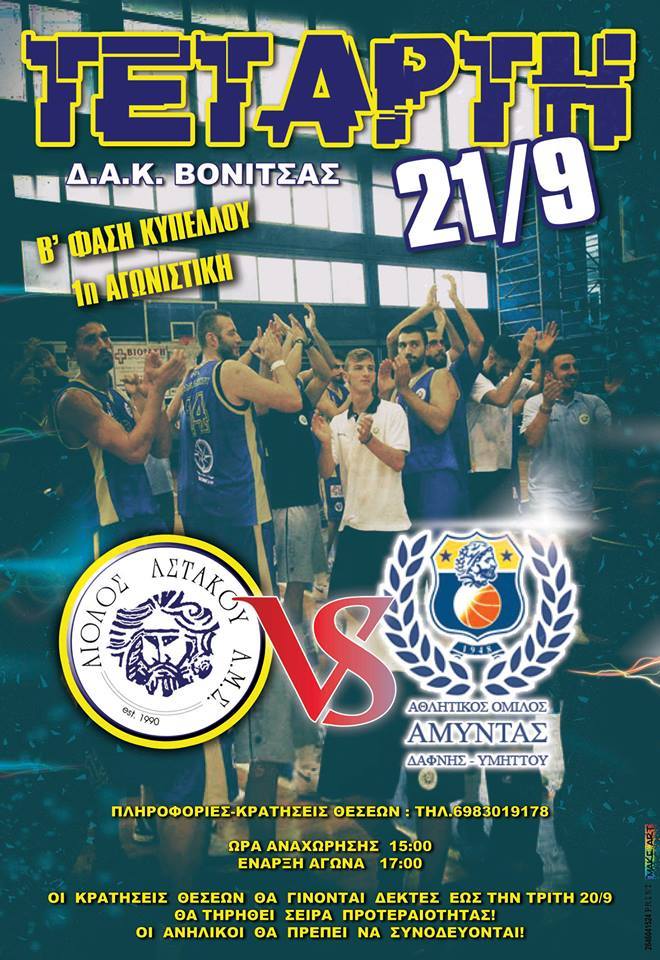 Στο ΔΑΚ Βόνιτσας, στις 17:00 το απόγευμα θα διεξαχθεί η επόμενη φάση (Β’ φάση) του Κυπέλλου Ελλάδος με τον Αίολο Αστακού -έχοντας ξεπεράσει το εμπόδιο του Χολαργού- να ψάχνει κάτι αντίστοιχο και κόντρα στον Αθλητικό Όμιλο Αμύντας.