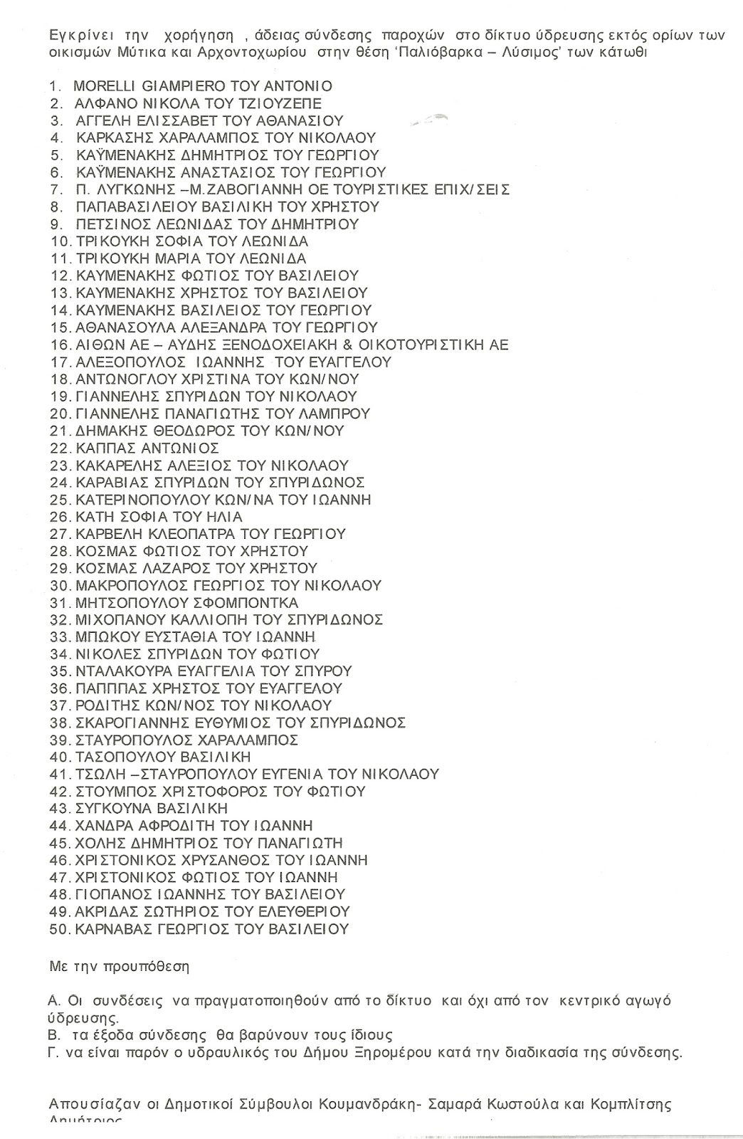 Mε την υπ’αρ.109/2015 απόφασή του το Δημοτικό Συμβούλιο Ξηρομέρου που συνεδρίασε την 27η Ιουνίου ενέκρινε τις αιτήσεις 50 συμπολιτών μας για παροχή δικαιώματος ύδρευσης στο νέο δίκτυο στην παραλιακή ζώνη “Παλιόβαρκα-Λύσιμος”. Είχε προηγηθεί η θετική γνωμοδότηση των Τοπικών Συμβουλίων Αρχοντοχωρίου και Μύτικα στις οποίες διοικητικά ανήκει η περιοχή.