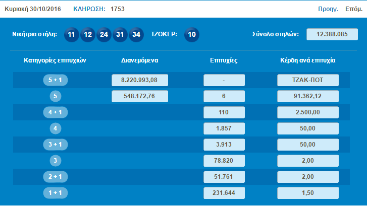 € 9.300.000 τουλάχιστον θα μοιραστούν οι τυχεροί της 1ης κατηγορίας στην επόμενη κλήρωση της ΠΕΜΠΤΗΣ 03/11/2016 μετά το ΤΖΑΚ-ΠΟΤ που σημειώθηκε κατά τη σημερινή διαλογή της 1753ης κλήρωσης του ΤΖΟΚΕΡ.
