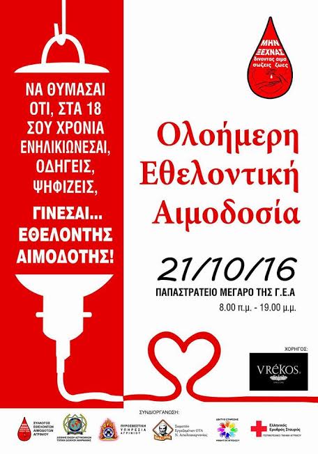 Ο Σύλλογος Εθελοντών Αιμοδοτών Αγρινίου σε συνεργασία με το Γενικό Νοσοκομείο Αγρινίου σας προσκαλεί στην Ολοήμερη Εθελοντική Αιμοδοσία, που θα πραγματοποιηθεί την Παρασκευή 21 Οκτωβρίου 2016 στο Παπαστράτειο Μέγαρο της Γ.Ε.Α. από τις 8πμ –7μμ.