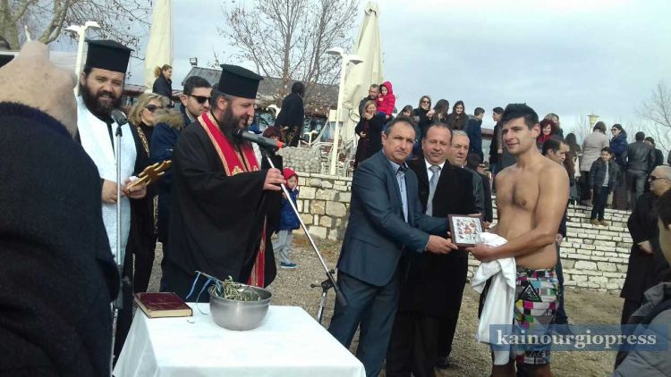 Αψηφώντας το κρύο ο Ευθύμιος Μαμασούλας βούτηξε και έπιασε το Σταυρό,όπως η Χριστιανική Παράδοση ορίζει και ο πρόεδρος του Καινουργίου του απέμεινε συμβολικά Εικόνα.