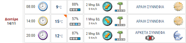 Άλλες Ειδήσεις Ο καιρός στο Αγρίνιο σήμερα (Δευτέρα, 14/11) 14 Νοέ 2016 AgrinioTimes Share Tweet meteo.gr ☆ Ακολουθήστε μας στο Google News Σχετικά θέματα: Advertisement Τελευταία νέα →2 Απρ 2026 11:02Τροχαίο κοντά στο Δημοτικό Αθλητικό Κέντρο Αγρινίου, όχημα Οδικής Βοήθειας στο σημείο2 Απρ 2026 10:44Ημερήσιες Προβλέψεις για τα Ζώδια (02/04)2 Απρ 2026 10:38Εορτολόγιο: 02 Απριλίου τιμάται από την Εκκλησία ο Όσιος Τίτος ο Θαυματουργός2 Απρ 2026 01:37Γεγονότα που σημειώθηκαν σαν σήμερα (02/04)2 Απρ 2026 01:31Ο Καιρός (02/04): Βροχές και καταιγίδες στο Αγρίνιο, έως 14 βαθμούς Κελσίου η θερμοκρασία1 Απρ 2026 23:59Σκάνδαλο Ο.Π.Ε.Κ.Ε.Π.Ε.: Στη νέα δικογραφία 11 Βουλευτές της Νέας Δημοκρατίας – Μεταξύ τους και νυν Υπουργοί1 Απρ 2026 22:08Δήμος Αγρινίου: Διανομή νωπού αρνίσιου κρέατος και άλλων ειδών διατροφής από το Κοινωνικό Παντοπωλείο1 Απρ 2026 21:38Σπύρος Διαμαντόπουλος: «Έχει δημιουργηθεί ψεύτικο προφίλ που χρησιμοποιεί το όνομά μου και την εικόνα μου»1 Απρ 2026 20:40Γιάννης Κυράστας: Πέρασαν 22 χρόνια από τον θάνατό του και η Α.Ε.Μ. δεν τον ξεχνά!1 Απρ 2026 20:09Συνάντηση Κώστα Καραγκούνη – Άδωνι Γεωργιάδη για την ενίσχυση των Δομών Υγείας στην Αιτωλοακαρνανία
