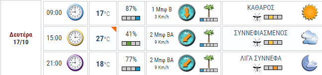 Δευτέρα 17/10, προβλέπεται καλός καιρός με αραιή συννεφιά, με τη θερμοκρασία να κυμαίνεται από 17 έως 26 βαθμούς Κελσίου και μέτριους βορειοανατολικούς ανέμους έντασης 4 μποφόρ. Μετά το μεσημέρι της ίδιας ημέρας περιμένουμε αλλαγή στο σκηνικό του καιρού, με καθαρό ουρανό, με την θερμοκρασία να αγγίζει τους 18 βαθμούς Κελσίου και μικρή εξασθένιση των ανέμων, από ανατολική κατεύθυνση και ένταση μέχρι 2 μποφόρ.
