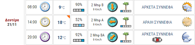 Άλλες Ειδήσεις Ο καιρός στο Αγρίνιο σήμερα (Δευτέρα, 21/11) 21 Νοέ 2016 AgrinioTimes Share Tweet meteo.gr ☆ Ακολουθήστε μας στο Google News Σχετικά θέματα: Advertisement Τελευταία νέα →2 Απρ 2026 14:00Παναγιώτης Νταλακούρας: Σε ηλικία 69 ετών άφησε την τελευταία του πνοή, πατέρας ενός παιδιού2 Απρ 2026 13:49Καμαρούλα Αγρινίου: Χάθηκε ο Κανέλος, δηλώθηκε στην Αστυνομία η εξαφάνιση του τετράποδου2 Απρ 2026 13:34Κυριάκος Μητσοτάκης: Την Κυριακή των Βαΐων στο Μεσολόγγι για τις Εορτές Εξόδου 20262 Απρ 2026 13:16Άγιος Κωνσταντίνος Αγρινίου: Φωτιά στην κουζίνα σπιτιού οδήγησε ηλικιωμένη στο Νοσοκομείο2 Απρ 2026 11:02Τροχαίο κοντά στο Δημοτικό Αθλητικό Κέντρο Αγρινίου, όχημα Οδικής Βοήθειας στο σημείο2 Απρ 2026 10:44Ημερήσιες Προβλέψεις για τα Ζώδια (02/04)2 Απρ 2026 10:38Εορτολόγιο: 02 Απριλίου τιμάται από την Εκκλησία ο Όσιος Τίτος ο Θαυματουργός2 Απρ 2026 01:37Γεγονότα που σημειώθηκαν σαν σήμερα (02/04)2 Απρ 2026 01:31Ο Καιρός (02/04): Βροχές και καταιγίδες στο Αγρίνιο, έως 14 βαθμούς Κελσίου η θερμοκρασία1 Απρ 2026 23:59Σκάνδαλο Ο.Π.Ε.Κ.Ε.Π.Ε.: Στη νέα δικογραφία 11 Βουλευτές της Νέας Δημοκρατίας – Μεταξύ τους και νυν Υπουργοί