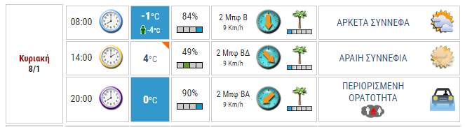 Την Κυριακή, 8 Ιανουαρίου 2017 αναμένονται νεφώσεις κατά περιόδους αυξημένες σε όλη τη χώρα. Από την αρχή του εικοσιτετραώρου έως και το μεσημέρι αναμένονται τοπικές χιονοπτώσεις στην Χαλκιδική, την ανατολική Θεσσαλία, την κεντρική και ανατολική Στερεά, τα ορεινά και ημιορεινά της Πελοποννήσου καθώς και τα ορεινά του Αιγαίου και το νότιου Ιονίου. Τοπικές βροχές ή χιονόνερο αναμένονται στα πεδινά των προαναφερθεισών νησιωτικών περιοχών. Από το μεσημέρι τα φαινόμενα θα περιοριστούν κυρίως στο Αιγαίο, ενώ προς το βράδυ αναμένονται εκ νέου χιονοπτώσεις στη Θράκη και την ανατολική Μακεδονία. Ολικός παγετός θα σημειωθεί στη Θράκη, τη Μακεδονία, τη βόρεια Ήπειρο, τη Θεσσαλία, και την κεντρική και ανατολική Στερεά, στα ορεινά και ημιορεινά της νότιας Ηπείρου, της δυτικής Στερεάς, και της Πελοποννήσου, καθώς και στα ορεινά των νησιωτικών περιοχών. Η θερμοκρασία δεν θα παρουσιάσει αξιόλογη μεταβολή. Οι άνεμοι στο Αιγαίο δεν θα ξεπερνούν τα 8 μποφόρ.