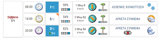 Το Σαββάτο, 7 Ιανουαρίου 2017 αναμένονται νεφώσεις κατά περιόδους αυξημένες, σε όλη την χώρα, αλλά κυρίως στα κεντρικά, νότια και ανατολικά διαμερίσματα. Από την αρχή της ημέρας και έως το μεσημέρι θα σημειωθούν τοπικές, παροδικές χιονοπτώσεις στα ορεινά και ημιορεινά όλης της χώρας, καθώς και σε πεδινές περιοχές της ηπειρωτικής χώρας. Τοπικές βροχές ή όμβροι θα σημειωθούν στο κεντρικό και νότιο Ιόνιο και το Αιγαίο. Από το μεσημέρι και έπειτα, τα φαινόμενα θα περιοριστούν στην ανατολική Μακεδονία και Χαλκιδική, στην Μαγνησία, στην Στερεά, στην Πελοπόννησο, το νότιο Ιόνιο και το Αιγαίο, καθώς και σε μεμονωμένες περιοχές του Ολύμπου, της Πίνδου και της Ροδόπης. Η θερμοκρασία θα παρουσιάσει πτώση, της τάξης των 5 έως 8 βαθμών, κυρίως στην κεντρική και νότια χώρα. Ολικός παγετός αναμένεται σε όλη τη Θράκη, τη Μακεδονία, την Ήπειρο και τη Θεσσαλία. Μερικός παγετός (έως το ξημέρωμα και προς το βράδυ) αναμένεται στα ημιορεινά και ορεινά αλλά και κάποιες πεδινές περιοχές της Στερεάς και της Πελοποννήσου. Οι άνεμοι στο Αιγαίο θα παρουσιάσουν μικρή εξασθένηση.