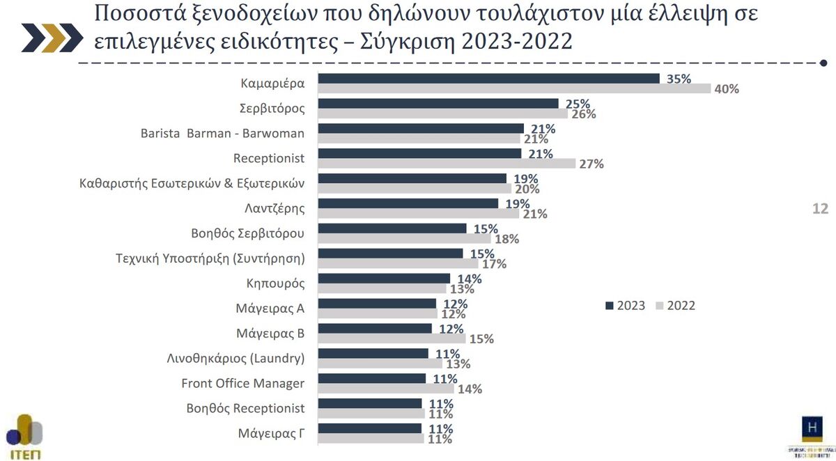 Αξίζει να σημειωθεί ότι από το σύνολο των ξενοδοχείων, το 35% εμφανίζει έλλειψη σε τουλάχιστον μία θέση καμαριέρας, το 25% εμφανίζει έλλειψη σε τουλάχιστον μία θέση σερβιτόρου, το 21% εμφανίζει έλλειψη σε τουλάχιστον μία θέση receptionist και Barista/Barman-Barwoman και Receptionist, και το 19% εμφανίζει έλλειψη σε τουλάχιστον μία θέση καθαριστή εσωτερικών και εξωτερικών χώρων και λαντζέρη.