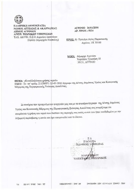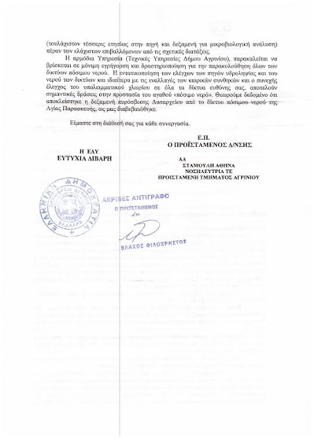 Η αρμόδια Υπηρεσία (Τεχνικές Υπηρεσίες Δήμου Αγρινίου), παρακαλείται να βρίσκεται σε μόνιμη εγρήγορση και δραστηριοποίηση για την παρακολούθηση όλων των δικτύων πόσιμου νερού. Η εντατικοποίηση των ελέγχων των πηγών υδροληψίας και του νερού των δικτύων και ιδιαίτερα με τις εναλλαγές των καιρικών συνθηκών και ο συνεχής έλεγχος του υπολειμματικού χλωρίου σε όλα τα δίκτυα ευθύνης σας, αποτελούν σημαντικές δράσεις στην προστασία του αγαθού «πόσιμο νερό». Θεωρούμε δεδομένο ότι αποκλείστηκε η δεξαμενή πυρόσβεσης Δασαρχείου από το δίκτυο πόσιμου νερού της Αγίας Παρασκευής, ως μας διαβεβαιώθηκε».http://skouteranews.blogspot.gr/