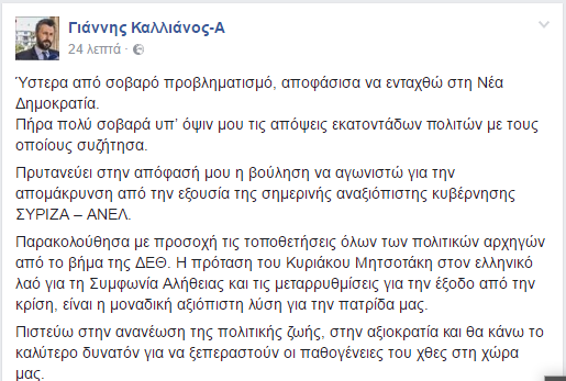 Στη Νέα Δημοκρατία ο Γ. Καλλιάνος – Οι πρώτες δηλώσεις του ίδιου