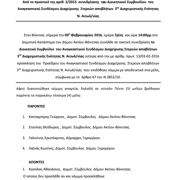 Από το πρακτικό της αριθ. 2/2015 συνεδρίασης του Διοικητικού Συμβουλίου του Αναγκαστικού Συνδέσμου Διαχείρισης Στερεών αποβλήτων 3ης Διαχειριστικής Ενότητας Ν. Αιτωλ/νίας
