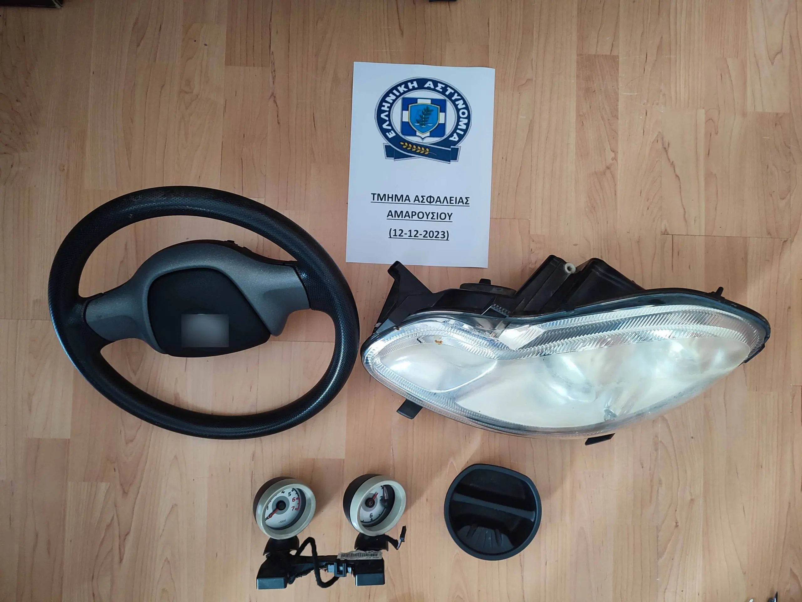 Μετά από ενδελεχή έρευνα στο όχημα και στην κατοχή των επιβαινόντων βρέθηκαν και κατασχέθηκαν μεταξύ άλλων πλήθος διαρρηκτικών εργαλείων και εξαρτήματα αυτοκινήτων. Συγκεκριμένα: