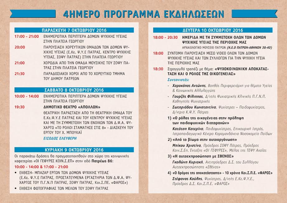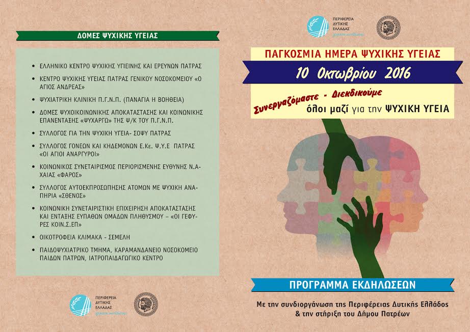 Σύμπραξη φορέων ενόψει της Παγκόσμιας Ημέρας Ψυχικής Υγείας – Τετραήμερο δράσεων στην Πάτρα από αύριο μέχρι τη Δευτέρα