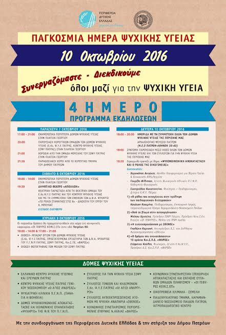 Ένα τετραήμερο εκδηλώσεων για την Ψυχική Υγεία συνδιοργανώνει η Περιφέρεια Δυτικής Ελλάδας μαζί με φορείς και τη στήριξη του Δήμου Πατρέων, ενόψει και της Παγκόσμιας Ημέρας Ψυχικής Υγείας.