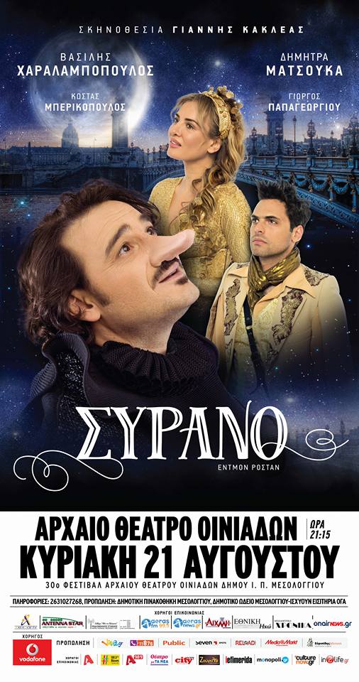 Τελευταία παράσταση του φετεινού φεστιβάλ Οινιαδών με το ” Συρανό Ντε Μπερζεράκ” στις 21-8-2016 και ώρα 21.15 στο αρχαίο Θέατρο. Όπως πάντα προπωλούνται εισιτήρια στη Δημοτική Πινακοθήκη και στο Πνευματικό Κέντρο του Δήμου. Πληροφορίες στο 2631027268.