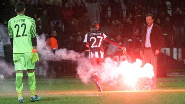 Η φωτοβολίδα εκτοξεύτηκε από τα χαμηλά της Θύρας 4 κι έγινε άμεσα αντιληπτός από τους υπόλοιπους οπαδούς οι οποίοι μάλιστα τον έβγαλαν εκτός γηπέδου. Ο νεαρός δράστης υποστήριξε ότι ήθελε να την πετάξει προς τα επάνω, αλλά τον σκούντηξε ο διπλανός με συνέπεια η φωτοβολίδα να φύγει εντός του αγωνιστικού χώρου.