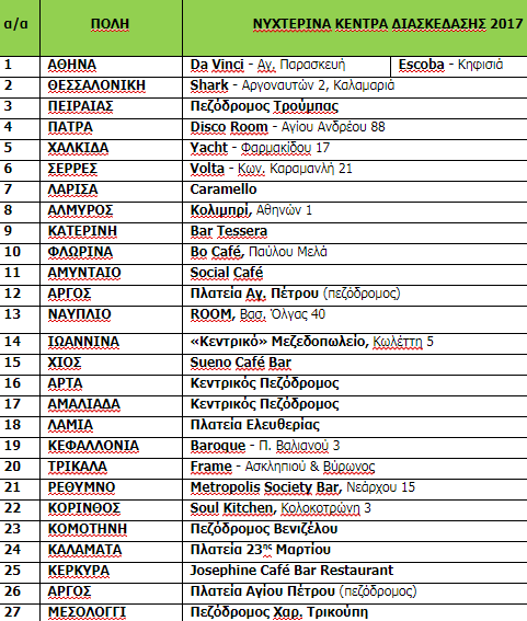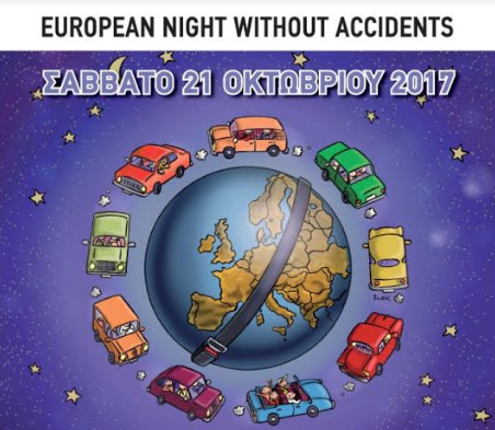 Με κεντρικό μήνυμα «το αλκοόλ και η οδήγηση δεν πάνε μαζί», το Ινστιτούτο Οδικής Ασφάλειας (Ι.Ο.ΑΣ.) «Πάνος Μυλωνάς» διοργανώνει το Σάββατο 21 Οκτωβρίου 2017 την 11η «Ευρωπαϊκή Νύχτα χωρίς Ατυχήματα» σε 27 πόλεις της Ελλάδας. Η ενέργεια πραγματοποιείται, όπως κάθε χρόνο, ταυτόχρονα με τη μεγάλη Πανευρωπαϊκή διοργάνωση, με στόχο την ενημέρωση και ευαισθητοποίηση κοινού και οδηγών για τους κινδύνους της οδήγησης υπό την επήρεια αλκοόλ.