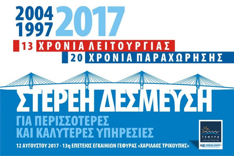 Η φετινή επέτειος εγκαινίων της Γέφυρας συμπίπτει επίσης και με τη συμπλήρωση 20 χρόνων από την υπογραφή της σύμβασης παραχώρησης του Έργου της Ζεύξης Ρίου – Αντιρρίου.