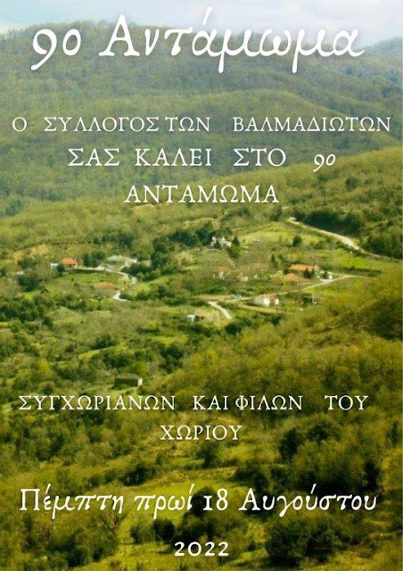 Η Ομάδα Πρωτοβουλίας των Βαλμαδιωτών της Αθήνας, συνεχίζοντας την παράδοση των τελευταίων χρόνων, πραγματοποιεί εφέτος το καλοκαίρι το ένατο (9ο) Αντάμωμα των συγχωριανών μας στη Βαλμάδα Βάλτου, στη γενέτειρά μας.