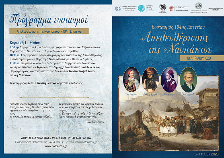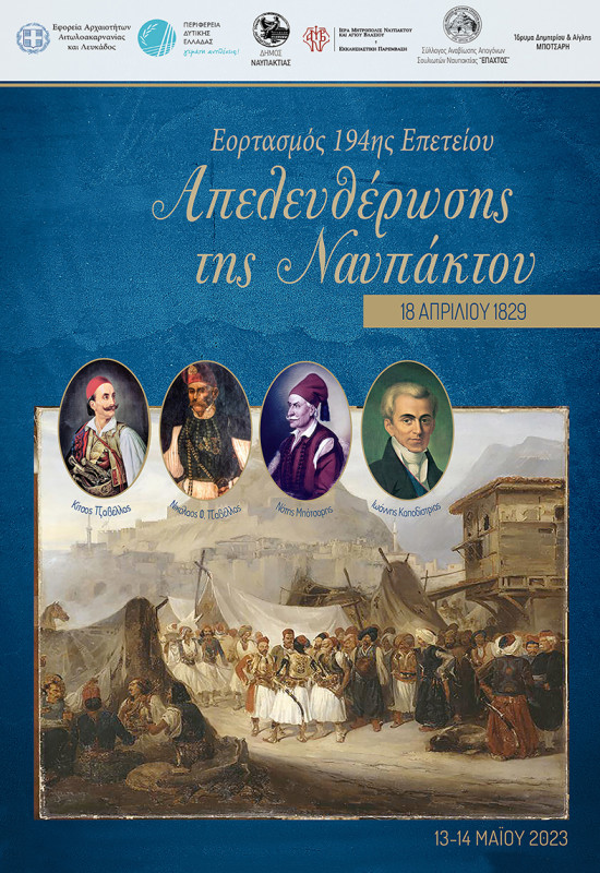 Ο Δήμος Ναυπακτίας, η Εφορεία Αρχαιοτήτων Αιτωλοακαρνανίας και Λευκάδος, ο Σύλλογος Αναβίωσης Απογόνων Σουλιωτών Ναυπακτίας «ΕΠΑΧΤΟΣ», η Περιφέρεια Δυτικής Ελλάδος, η Ιερά Μητρόπολη Ναυπάκτου και Αγίου Βλασίου, το Ίδρυμα Δημητρίου και Αγλαΐας Μπότσαρη συμμετέχουν στη διοργάνωση του Εορτασμού της 194ης Επετείου της Απελευθέρωσης της Ναυπάκτου που θα πραγματοποιηθεί στις 13 και 14 Μαΐου 2023.