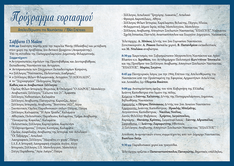 8:45 μ.μ. Πανηγυρικός λόγος για την 194η Επέτειο της Απελευθέρωσης της Ναυπάκτου από την Προϊσταμένη της Εφορείας Αρχαιοτήτων Αιτωλ/νίας