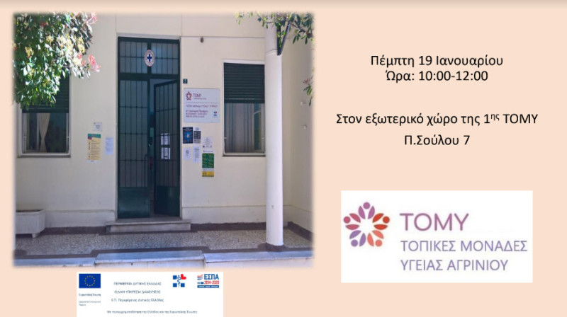 Στο πλαίσιο του Προγράμματος «Διατροφή και Υγεία», την Πέμπτη, 19 Ιανουαρίου η 1η και 3η ΤΟ.Μ.Υ. Αγρινίου θα πραγματοποιήσουν συμβουλευτική και δωρεάν μετρήσεις: δείκτη μάζας σώματος, αρτηριακής πίεσης, σακχάρου αίματος ,ολικής χοληστερόλης, σφύξεων, κορεσμού οξυγόνου.
