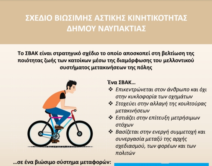 Εφαρμόζοντας τις εθνικές και ευρωπαϊκές οδηγίες για επιδίωξη βιώσιμων αστικών μεταφορών, ο Δήμος Ναυπακτίας προχωρά στην εκπόνηση του Σχεδίου Βιώσιμης Αστικής Κινητικότητας (ΣΒΑΚ), το οποίο θα προδιαγράψει το μελλοντικό σύστημα μετακινήσεων της πόλης μας.