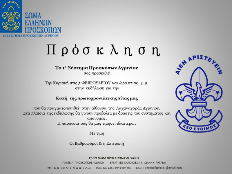 Το 1ο Σύστημα Προσκόπων Αγρινίου σας προσκαλεί την Κυριακή, 5 Φεβρουαρίου και ώρα 19:00 στην εκδήλωση για την Κοπή της Πρωτοχρονιάτικης Πίτας που θα πραγματοποιηθεί στην αίθουσα της Λαχαναγοράς Αγρινίου.