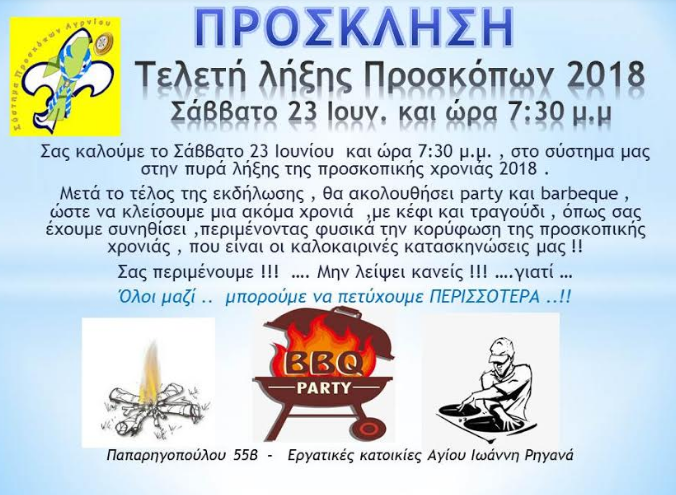 Τελετή λήξης Προσκόπων 2018 το Σάββατο 23 Ιουνίου και ώρα 7:30 μ.μ. στο σύστημα μας στην πυρά λήξης της προσκοπικής χρονιάς 2018. Μετά το τέλος της εκδήλωσης, θα ακολουθήσει μία μεγάλη γιορτή, ώστε να κλείσουμε με κέφι και τραγούδι, όπως σας έχουμε συνηθίσει, περιμένοντας φυσικά την κορύφωση της προσκοπικής χρονιάς, που είναι οι καλοκαιρινές κατασκηνώσεις μας!!