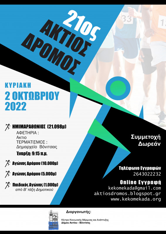 Την Κυριακή, 2 Οκτωβρίου ο Δήμος Ακτίου-Βόνιτσας και το Κέντρο Κοινωνικής Μέριμνας και Ανάπτυξης του Δήμου θα υποδεχθεί τους αθλητές δρομείς για τον 21ο Άκτιο Ημιμαραθώνιο Δρόμο.
