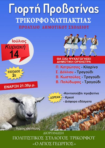 Την Κυριακή 14 Ιουλίου 2019 θα πραγματοποιηθεί η 2η Γιορτή Προβατίνας στο Τρίκορφο Ναυπακτίας και πιο συγκεκριμένα στο Προαύλιο του Δημοτικού Σχολείου.
