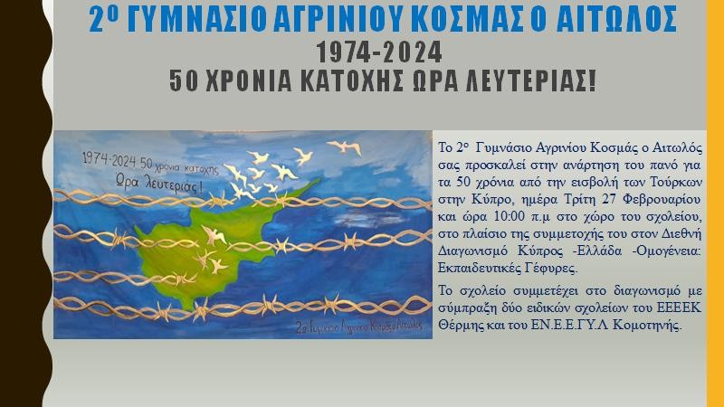 Το 2ο Γυμνάσιο Αγρινίου την Τρίτη, 27 Φεβρουαρίου 2024 και ώρα 10:00 π.μ. στο χώρο του Σχολείου θα πραγματοποιήσει εκδήλωση για τα 50 χρόνια από την τούρκικη εισβολή στην Κύπρο.